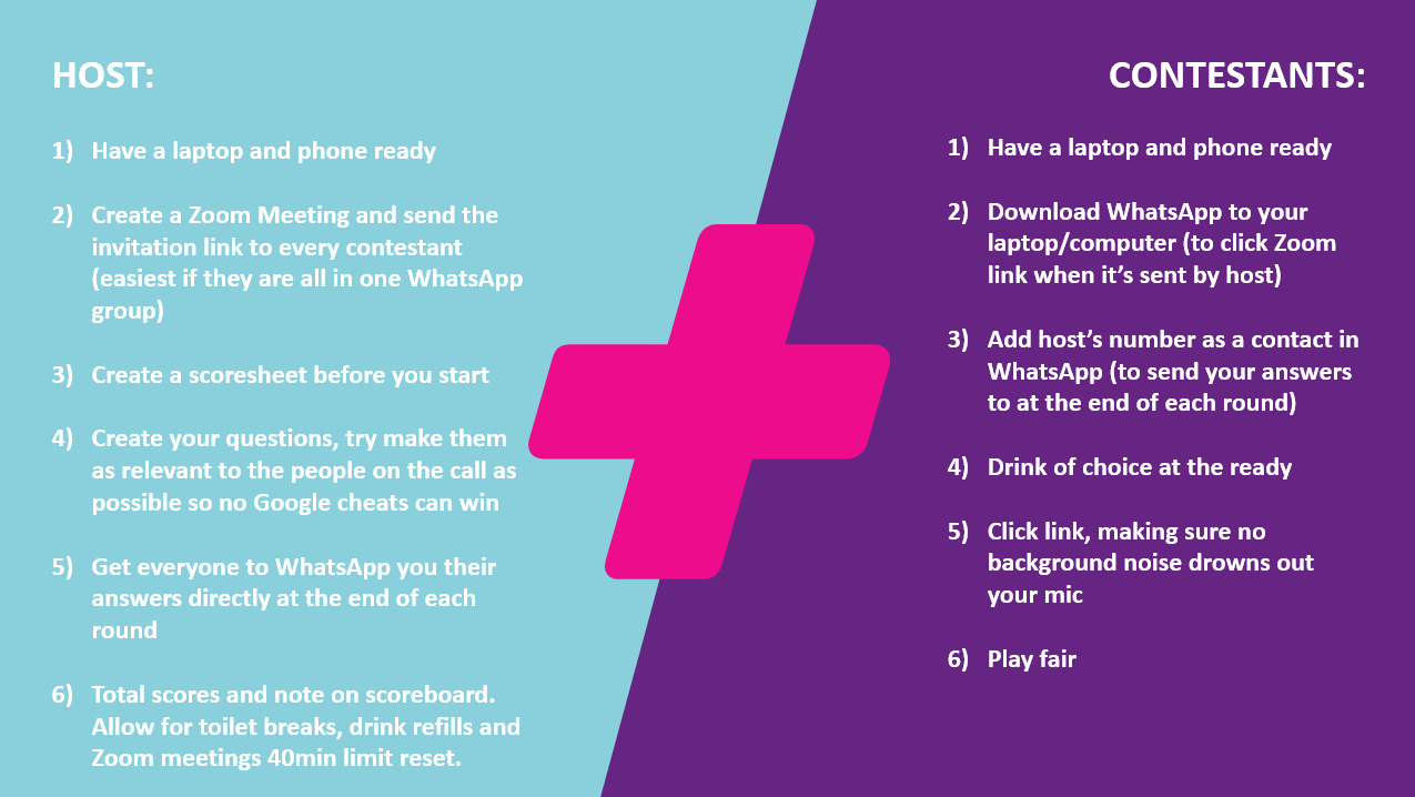 You’ve seen people sharing pictures of group video chats talking about the Quiz Night they’re hosting and you’ve floated the idea past your friends, they’re all in, so how do you do it? Here’s a handy little checklist for you to screenshot and send around. You as the host, must come up with the questions – make them local and relevant to only the people on the call as there’s always one who’ll take it too seriously and try Google the answer. These quizzes have taken up the majority of our evenings but the novelty hasn’t worn off yet. If the below seems like too much hassle, you can always download Kahoot and share the link with friends.